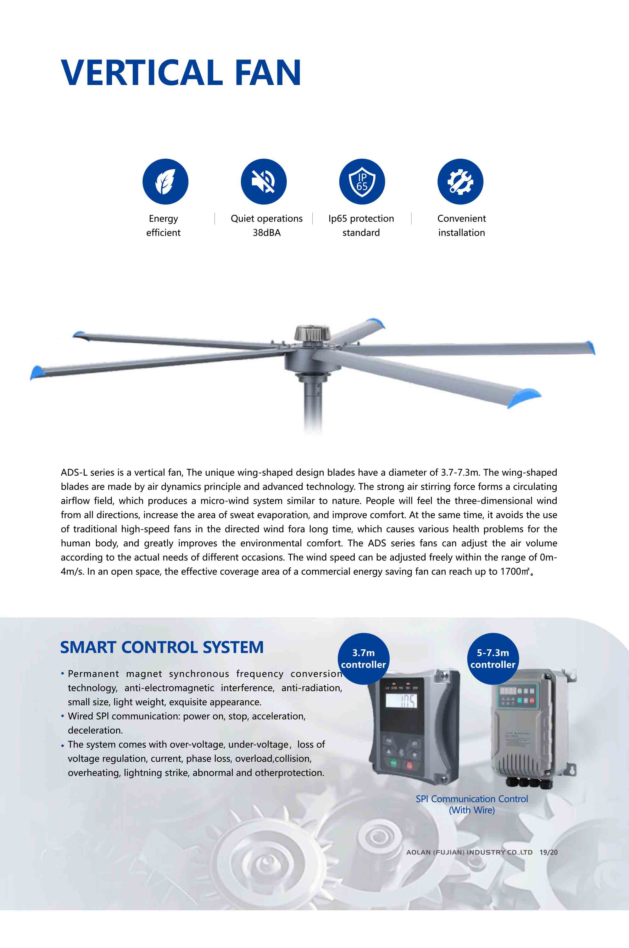 Our ADS-L series smart permanent magnet large outdoor stand fan is a new product specially developed for outdoor natual ventilation system. Self-designed variable frequency speed control, high efficiency and energy saving permanent magnet external rotor motor drive. It has the advantage of low noise, small volume, lightweight, compact structure and beautiful appearance.